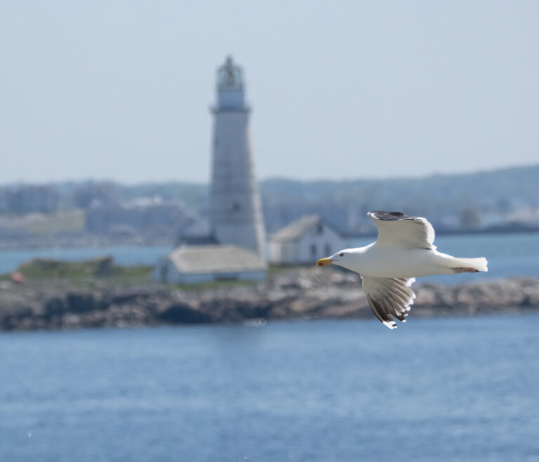 A Great Black-backed Gull, the largest gull species in the world and one of the birds featured in Bird Bingo, flies by Boston Light (National Park Service photo)